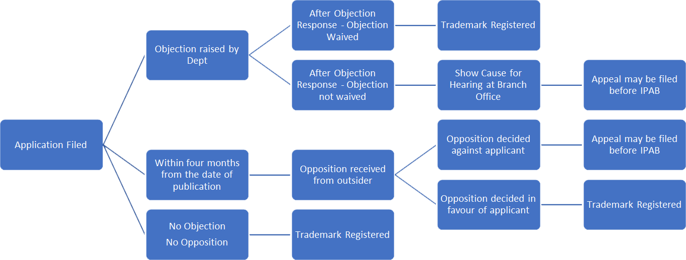 The Application is then examined mainly as to whether the relevant mark is capable of distinguishing the applicant’s goods or services, whether it is prohibited for registration under any law for the time being in force, whether the registration of the relevant mark is likely to cause confusion or deception because of earlier identical or similar marks existing on records. The Examination of all applications is done centrally in the Head Office of the TRADE MARKS Registry at Mumbai.